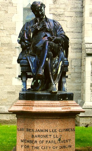 Sir Benjamin Guinness báró szobra a katedrális kertjében