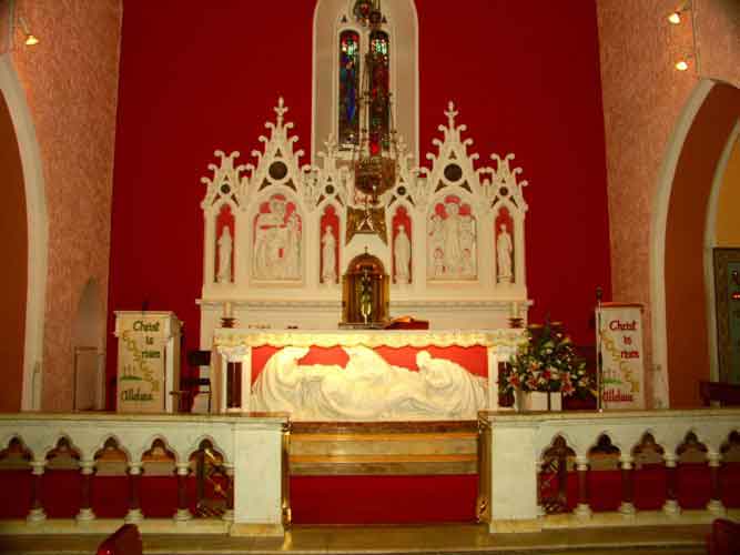 A plébánia templom szentélye, az oltár fölötti ablak körül a külső falon volt a jelenés