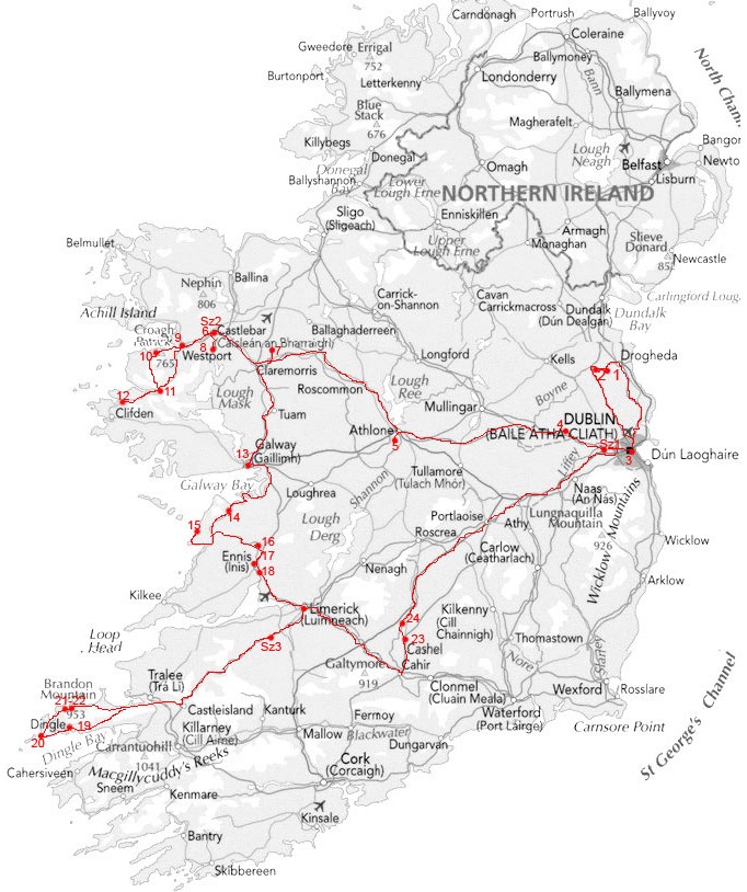Térbeli utazásunk az ország nagy részére kiterjedt, az északi és déli végeket leszámítva átutaztuk Írországot. A mellékelt térkép mutatja útvonalunkat és a meglátogatott helyeket.