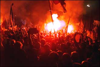 A háttérképen a tavalyi belgrádi tüntettés az országot lángbaborító diktátor ellen.