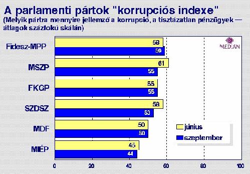 A korrupciós gyanu a kis és nagy pártokra egyaránt vonatkozik. Az ábra tanusítja, sikeres az a suttogó propaganda, hogy "ezek sem jobbak a többinél |