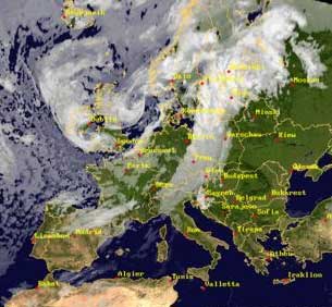 Ha az időjárás jelentéseket nem a megszokott gunyoros hitetlenkedéssel fogadjuk, hanem higgadtan figyeljük, jók-e az előrejelzések vagy sem, egyre gyakrabban állapíthatjuk meg, hogy azok pontosan írták le a jövendőt. Mindez, ha nem is kizárólag de jelentős részben a meteorológiai műholdak munkába állásának következménye.  Mit lehet az ezek által készített képeken látni? A szakemberek számára sok mindent. A képen példaként a 2008. augusztus 13-án készült egyik felvétel látható. A pillanatnyi helyzetet illetve az érvényes előrejelzést több honlapon megnézhetjük. Először - már csak egészséges nemzeti öntudatból is - a magyar meteorológiai szolgálat honlapját ajánljuk. Magyar nyelven is van már több nézhető honlap, Idegen nyelven - a megnézendő honlapok száma, mint égen a csillag.