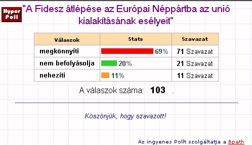 A szavazást lezártuk. Az eredményt nem kell kommentálnunk, olvasóink nagyrészt úgy gondolják, hogy a Fidesznek a konzervativ nemzetközi szervezetbe való átlépése növeli a kívánt unió létrehozásának esélyét.