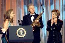 Clinton egy bálon, amelyet rákbetegek javára rendeztek, egy szaxofont kapott ajándékba.