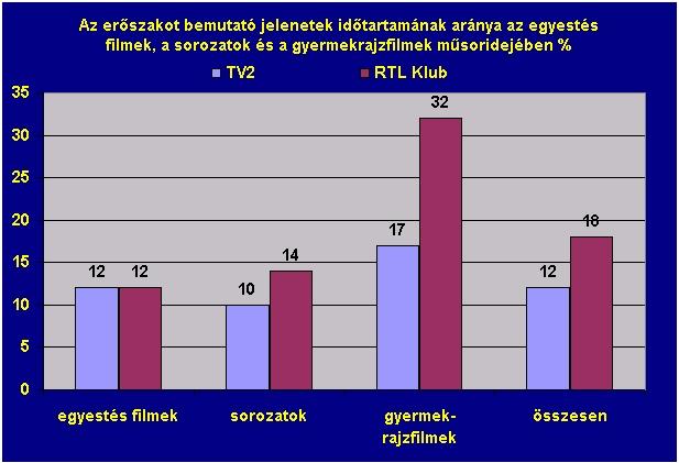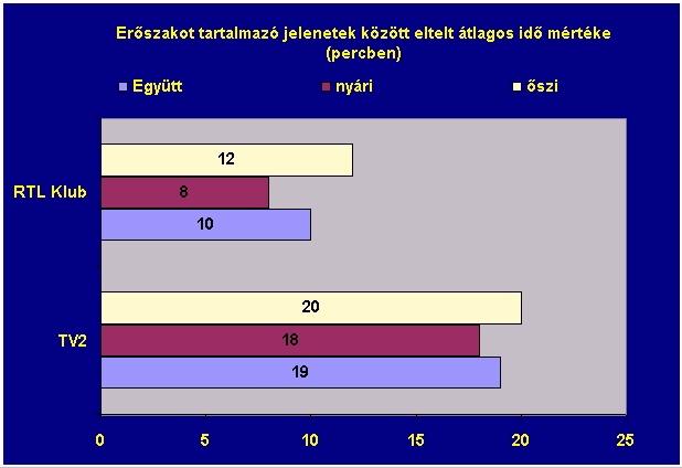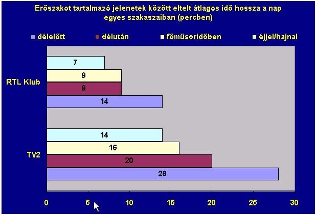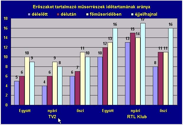 A két kereskedelmi csatorna abban egységesnek tűnt hogy a hétvégi napokon gyakrabban követték egymást az erőszakos képsorok (TV2:16 perc, RTL Klub:8 perc). A TV2-n hétköznapokon átlagosan 21, az RTL-n 10 percenként fordult el agresszív jelenet.