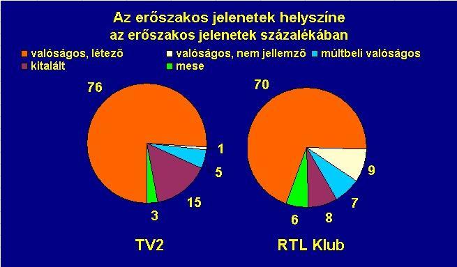 E szempontból a két csatorna erőszakos jelenetei csupán kis mértékben különböztek egymástól. A TV2 agresszív epizódjainak 76 százaléka játszódott olyan fizikai és dramaturgiai környezetben, amely a valós világban is létezik (7. ábra), míg az RTL Klubnál ez 70 százalék volt. Ez utóbbi műsorszolgáltatónál viszont lényegesen gyakrabban fordultak el olyan jelenetek, amelyek helyszínei ugyan elképzelhetőek a valóságban, de a nézők mindennapjaiban szinte bizonyosan nem fordulnak el (pl. tengeralattjáró, titkos NASA bázis). Ilyen valóságos ám a hétköznapi életben mégiscsak marginálisnak számító helyszínekhez az RTL erőszakos jeleneteinek 9 százaléka kötődött, miközben a TV2-nél ez csak 1 százalékot tett ki. Ugyancsak gyakrabban játszódtak az RTL Klub erőszakos jelenetei meseszerű környezetben (RTL: 6%, TV2: 3%).