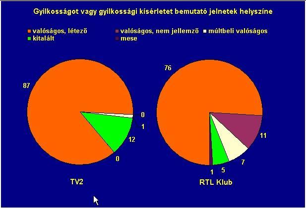 TV2 RTL Klub Átlag Gyilkosság vagy annak kísérlete 26 20 22 Verbális erőszak 22 20 21 Két ember verekedése/harca 19 17 18 Verés 5 12 9 Több ember verekedése/harca 8 8 8 Fogvatartás, elrablás 8 6 7 Tárgyak elleni erőszak (pl. randalírozás) 3 8 6 Katasztrófa 4 5 5 Háború 6 3 4 Autós ütközés 4 4 4 Nem emberi lények támadása 7 3 4 Egyéb bűncselekmény 2 3 3 Tömegverekedés 3 1 2 Kínzás 0 1 1 Öngyilkosság 1 1 1 Szexuális erőszak 0 0 0 Állatok elleni erőszak 0 0 0 Az erőszakos aktusok gyakoriságának sorrendjében nem voltak lényeges különbségek az adók között, viszont az egyes típusok előfordulásának arányaiban kisebb-nagyobb eltéréseket tapasztalhattunk. Gyilkossággal vagy gyilkossági kísérlettel a TV2-ben találkozhattak gyakrabban a nézők. Míg e csatorna erőszakos jeleneteinek több mint egynegyedében került sor ilyen jellegű aktusra (26%), addig az RTL Klubon "csak" minden ötödikben (20%). Ez utóbbinál viszont gyakrabban észleltünk olyan műsorrészeket, amelyekben ember vert embert, mégpedig úgy, hogy az áldozatok nem védekeztek vagy nem védekezhettek.