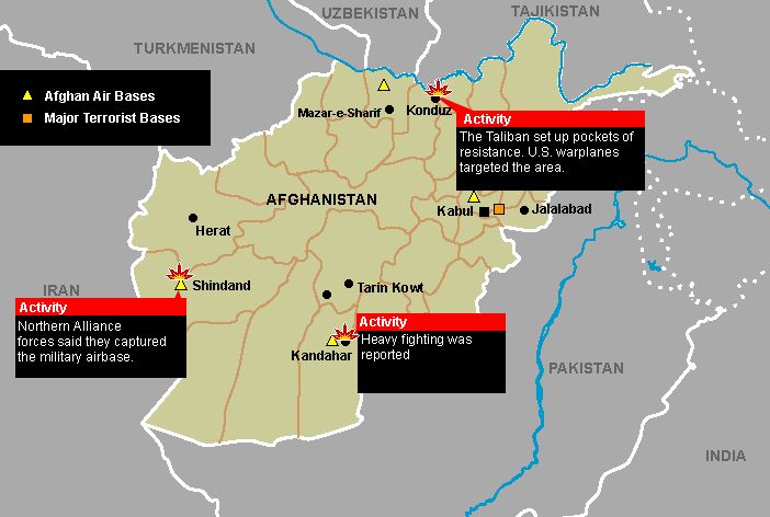 A hírek az Északi Szövetség folyamatos sikereiről szólnak, olykor egy-egy talibán cáfolat. Messzi vidék, nem sokat mond az olvasónak az az egy-két városnév, amelyről soha nem hallott korábban. Ezért adunk most közre egy térképet, amely segít eligazodni és a térben elhelyezni a hallottakat.Az igencsak valószínű, hogy döntő - és sikeres - fordulat állott be a hadihelyzetben, de a dolog végét még nem lehet látni. A feladat továbbra is nagy: el kellene fogni bin Ladent. Tűt a szalmakazalban.