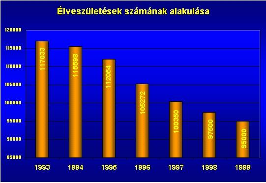 Az élve születések száma 1995-ben 3500-zal esett vissza, egy év múlva hétezres, majd egyre kisebb mértékű, de tartós maradt a visszaesés. 1994 és 1999 között összességében mintegy 18 ezer gyermekkel született kevesebb. A folyamat szerencsére az utóbbi hónapokban megtörni látszik, de erre később térünk vissza.