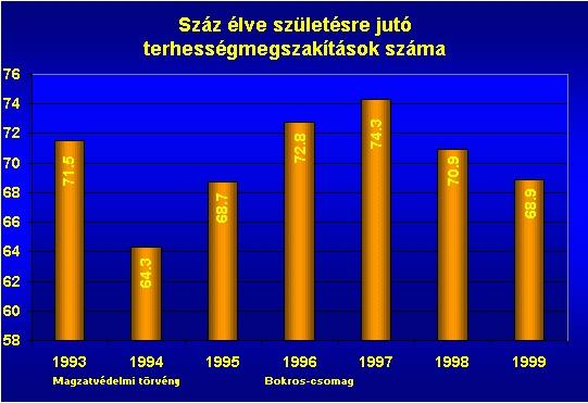 Az abortuszok számában is hasonló a változás, csak éppen ellenkező irányban. 1995-ben kettőezer-ötszázzal több terhességet szakíttattak meg, mint egy évvel korábban. Első ízben állt meg a terhesség-megszakítások csökkenésének folyamata. Bár azt követően évről évre hallhatjuk, hogy folytatódik ez a tendencia, figyelembe kell vennünk, hogy a terhesség-megszakításoknak a születések számához viszonyított aránya a Bokros-csomag óta sajnos folyamatosan romlik.