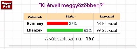 A hét végén fölfedezett bennünket egy-két MSZP-szimpatizáns. Hirtelen megugrott a pártszimpátia és míg korábban olvasóink mintegy 90 százaléka úgy gondolta, hogy a kormány munkájáról szóló beszámolóban a kormány érvelése volt a meggyőző, ma délelőtt megfordult ez az arány. Nem hisszük, hogy rendszeres olvasóink véleménye változott meg, de sajnos abban sem bízunk, hogy a rendszeres olvasók most hirtelen megtáltosodtak és az egyébként gyenge forgalmú hétvégén leadtak vagy 100 új szavazatot. A jelek másra utalnak. A magányos MSZP-s leült a számítógép elé és nyomta, nyomta, nyomta… Lelke rajta!