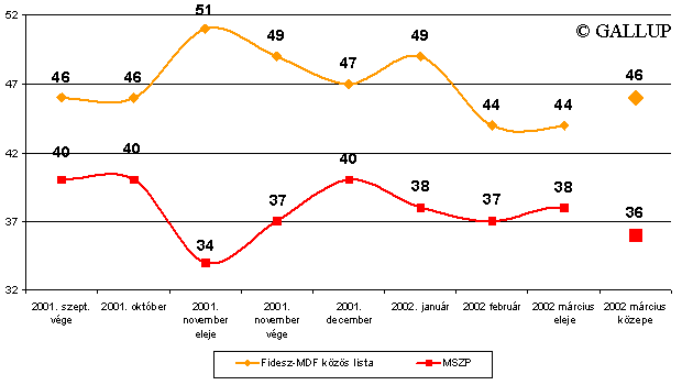 3. ábra: Pártpreferenciák 2001. szeptember - 2002. március a pártot választó biztos szavazók körében (2002 március elejéig), illetve a nagy valószínűséggel ténylegesen választó, pártot megnevezők között (2002 március közepe) A teljes elemzés a GALLUP oldalán
