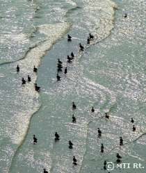 "Valamilyen fekete színű madarak úszkálnak. A víz fodrozódása sekély vízre utal. Így ez lehet tengerparton, lehet, hogy valamelyik folyó árterületén annak áradásakor.