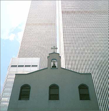 Ebből a szögből nehéz felismerni, de a kérdésben lévő dátum talán segít: igen a WTC, azaz a Világkereskedelmi Központ azóta megsemmisült épületéről van szó. Arra viszont nem sokan emlékeznek, hogy a két torony pusztulásának áldozata lett ez a kis templom is a kép előterében. Szent Miklós tiszteletére szentelt ortodox templomról van szó.