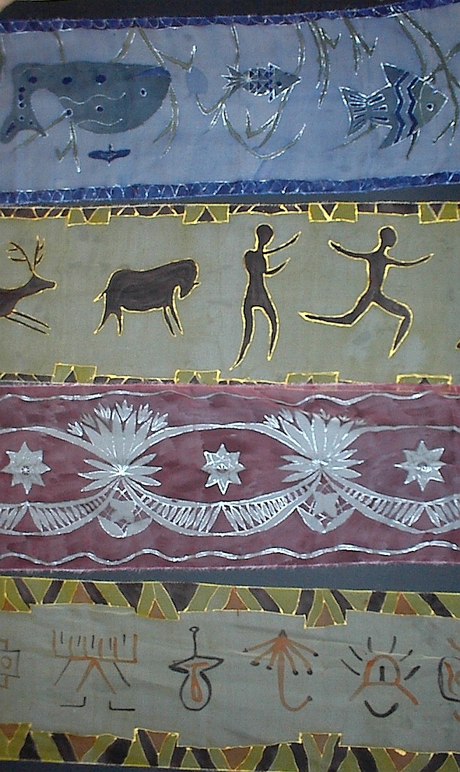 Az első képen festett selyemsálak láthatók, amelyeknek a festése házilagos.