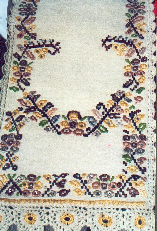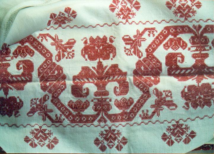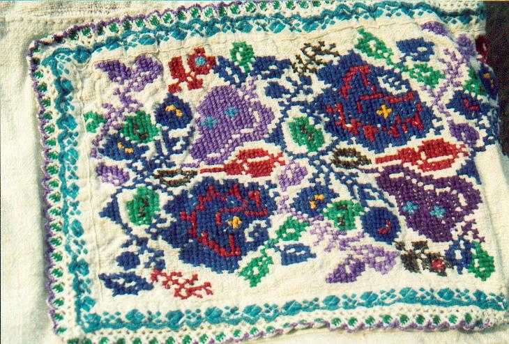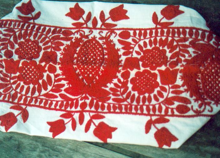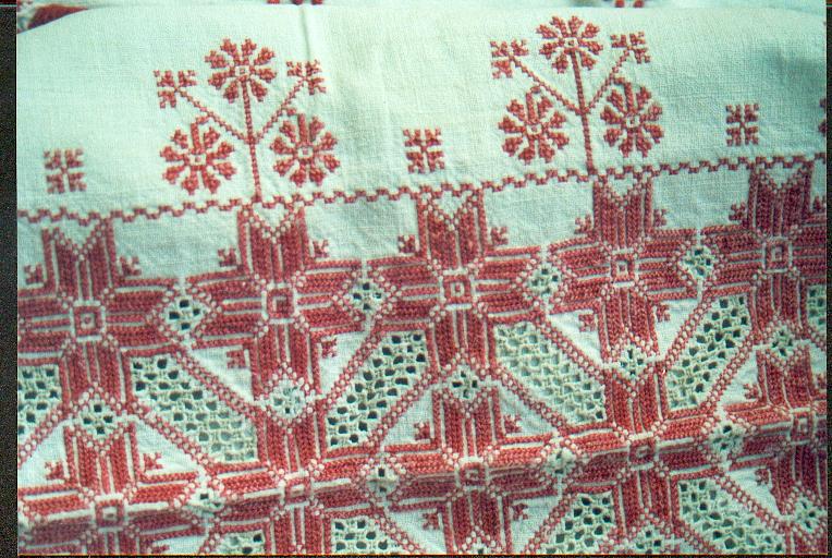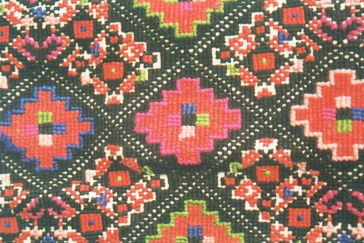 A szövésből a keresztszemes, a szálán varrott és a lapos hímzések származnak. A szőttesből kialakult hímzés megőrzi azokat a geometrikus szálhoz kötött díszítményeket, amelyek a szőttesre jellemzőek.