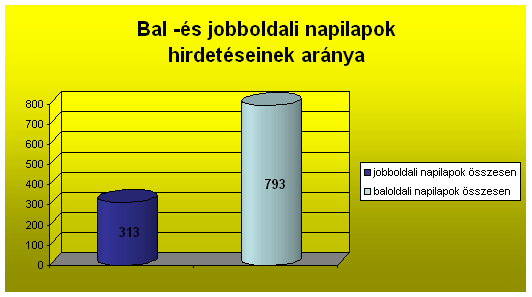 A 168 óra esetében kiemelkedő az állami hirdetések aránya, a vizsgált időszakban tizennyolc oldalt tesz ki. Mindez akkor különösen feltűnő, ha a jobb és a baloldalon keresünk hozzá viszonyítási pontokat. Vizsgálatunk esetében feltűnő különbség mutatkozik úgy a Magyar Narancs, mint a Demokrata kárára.