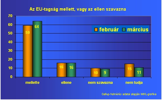 Tízből hatan jó dolognak tartják Magyarország EU-tagságát a Gallup március 7. és 12. között végzett reprezentatív felmérése szerint. A februári adatokhoz képest 8 százalékponttal nőtt az uniós tagságot jó dolognak tartók aránya. Az egy hónappal ezelőttihez képest jóval többen számítanak személyes előnyre: a felnőtt lakosság 43 százaléka. Ezzel a személyes előnyre számítók kerültek többségbe. A lakosság 74 százalékának magas a szavazási hajlandósága; biztosra a megkérdezettek 58 százaléka mondta, hogy részt venne egy "holnap rendezendő" uniós népszavazáson. A csatlakozást a lakosság 64 százaléka támogatná - ez 5 százalékponttal több, mint egy hónappal ezelőtt. Az EU-tagság ellen 16 százalék voksolna - ugyanannyian, mint február azonos időszakában. A biztos szavazóknak 78 százaléka mondta, hogy a tagság mellett szavazna.