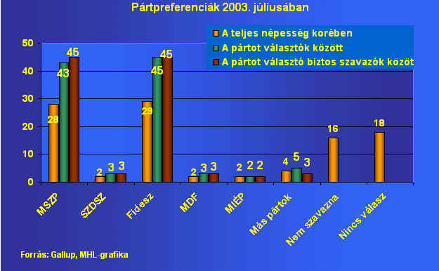 A 18 évesnél idősebb népességből egy most vasárnapi választáson a Gallup július 7. és 16. közötti közvélemény-kutatása szerint 28 százalék szavazna az MSZP-re, és 29 százalék a Fideszre. Az év eleje óta mindkét párt támogatottsága csökkenő tendenciájú. A bizonytalanok aránya a januári 22 százalékról júliusig 34 százalékra emelkedett. Az SZDSZ, az MDF, a MIÉP és a Centrum Párt egyaránt 2-2 százaléknyi szavazatra számíthatna.