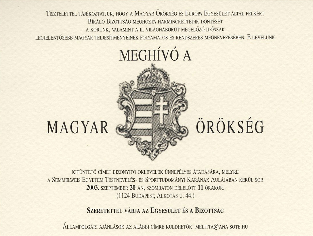 2003. szeptember 07. vasárnap 23:47 Meghívó a Magyar Örökség-díjkiosztó ünnepségére