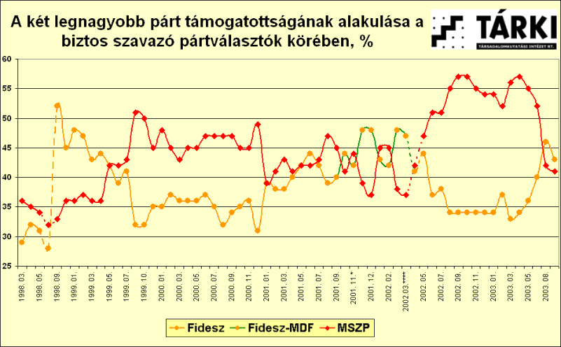 Az illusztrációként közölt grafikonok közül az első a Gallup mérése szeptemberben, a részletek a http://www.gallup.hu oldalon megismerhetők. A második (Tárki) grafikon szinte az elemzés mondanivalóját bizonyítja: a nyár végére megszerzett vezetés olvadni kezdett. Ugyancsak az elbizakodottság ellen hat, hogy az egyes közvéleménykutatók adata között nagy eltérések vannak. Egy azonban biztos: a szocialisták komolyan számolnak egy 2004. évi vereséggel és már előre vigasztalják magukat azzal: általános európai tapasztalat, hogy a választók "büntetik" a kormányokat. Ha valóban kikapnak, nagy belső forradalom lesz, de a hatalmat nem fogják kiengedni a kezükből. Ne becsüljük le kampány-képességeiket és a törvényes korlátokat is áttörő rámenősségüket. (Lásd Demecser)