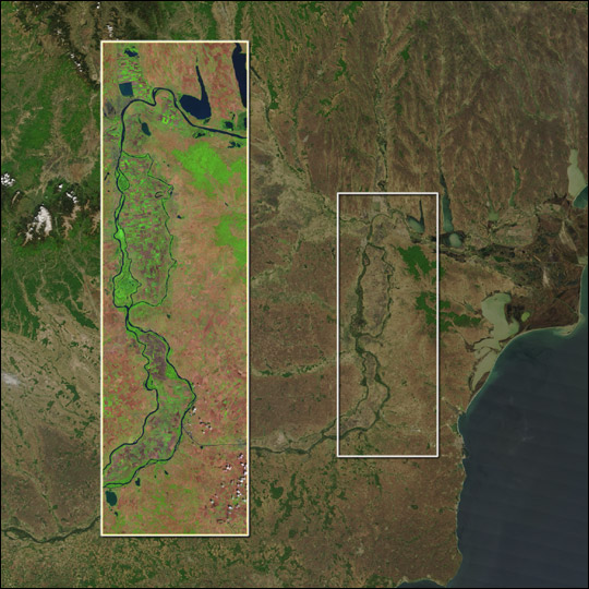 Most a NASA jóvoltából egy pillanat alatt áttekinthetjük a vidéket, s a Duna delta felé haladó, északnak forduló folyó két oldalán a "zöld folyosót".