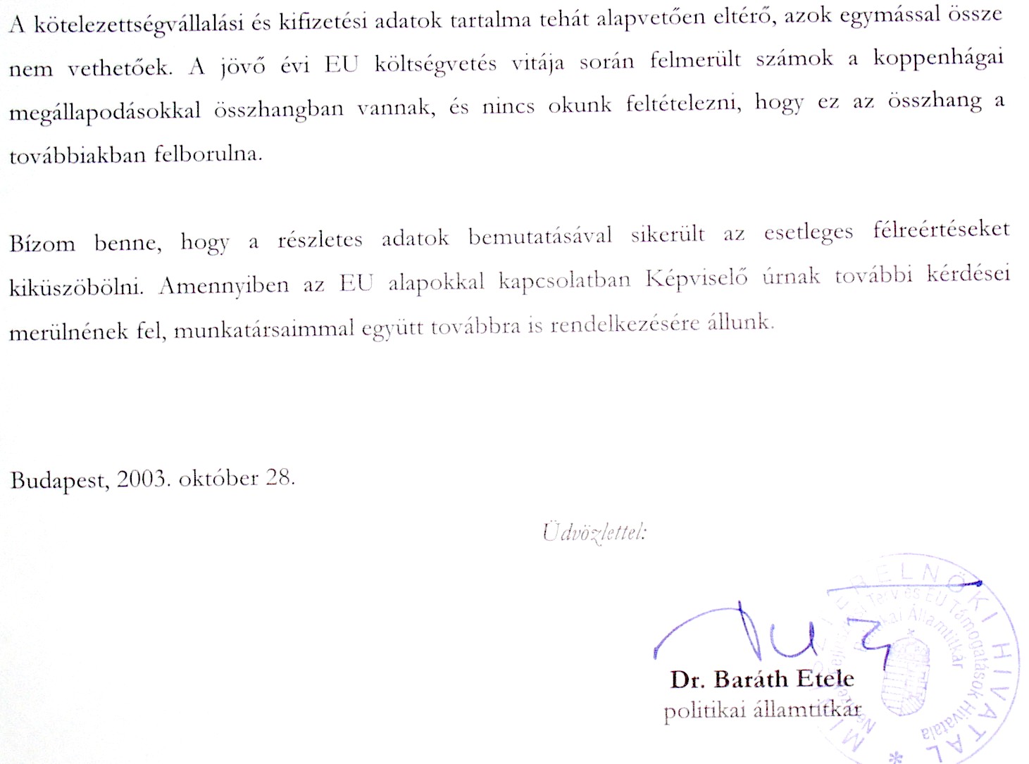 2. Baráth Etele államtitkár: "A jövő évi EU költségvetés vitája során felmerült számok a koppenhágai megállapodásokkal összhangban vannak, és nincs okunk feltételezni, hogy ez az összhang a továbbiakban felborulna."