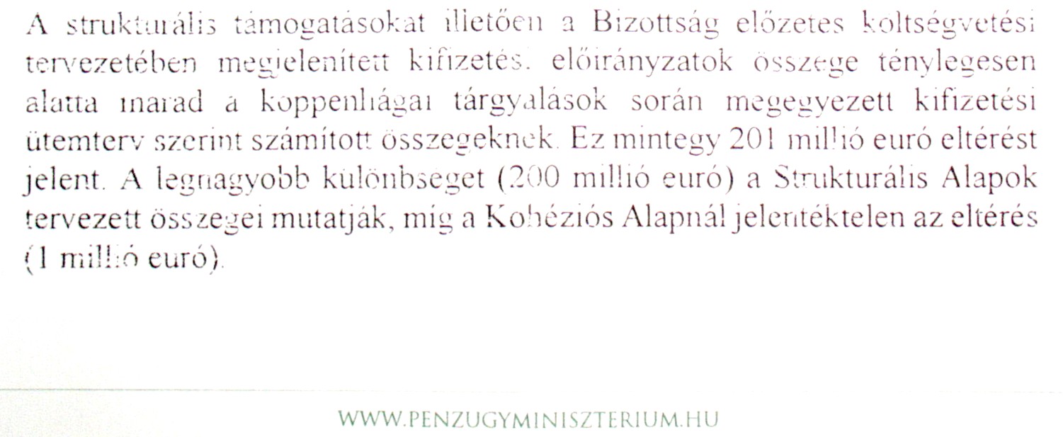 1. László Csaba pénzügyminiszter: "A strukturális támogatásokat illetően a Bizottság előzetes költségvetési tervezetében megjelenített kifizetési előirányzatok összege ténylegesen alatta marad a koppenhágai tárgyalások során megegyezett kifizetési ütemterv szerint számított összegeknek. Ez mintegy 201 millió euró eltérést jelent. A legnagyobb különbséget (200 millió euró) a Strukturális Alapok tervezett összegei mutatják, míg a Kohéziós Alapnál jelentéktelen az eltérés (1 millió euró)"