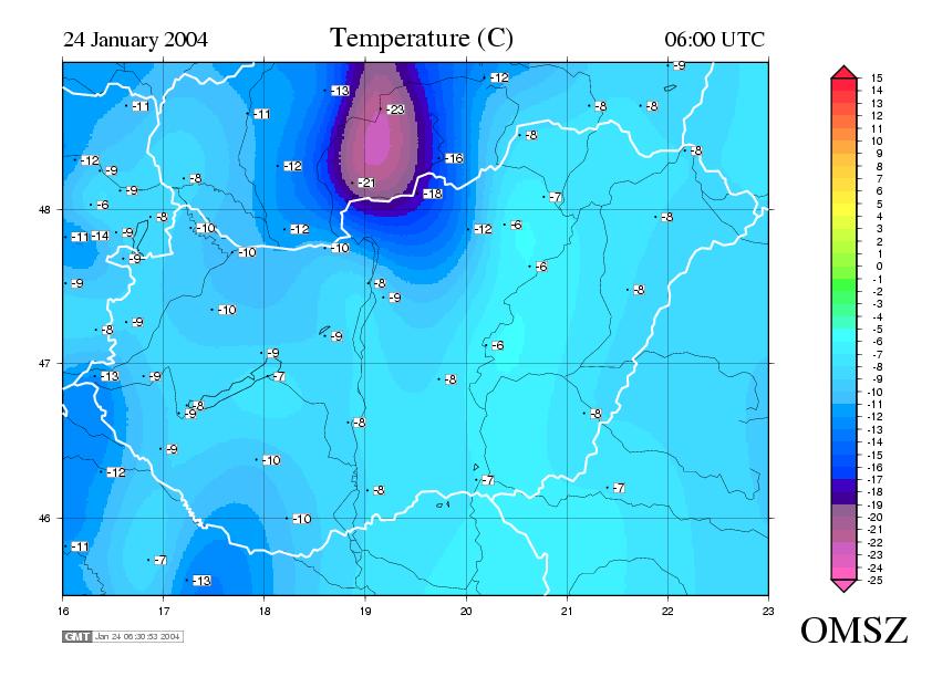 Legyünk reálisak. Ma, január 24-én Magyarországon tél van. De milyen tél? Szegeden kisebb hózápor, másutt borongós vagy derűs. A hőmérséklet délben - 1 és -4 között. Nézzétek meg, hogy néz ki Siófok? Igaz, reggel - néhol - cudar hidegek is voltak. Ez is megéri, hogy bemutassuk egy felvételt. (A Meteorológiai Intézet honlapján megtalálhatók az aktuális hőtérképek.) Érdemes megnézni, hogy a hideg hozzánk Közép-Szlovákiából érkezik. Mintegy lecsúszik az Alacsony Tátra déli lejtőjén, és nyomulását a nógrádi dombok alig, de a Cserhát már megtudja akasztani.