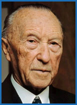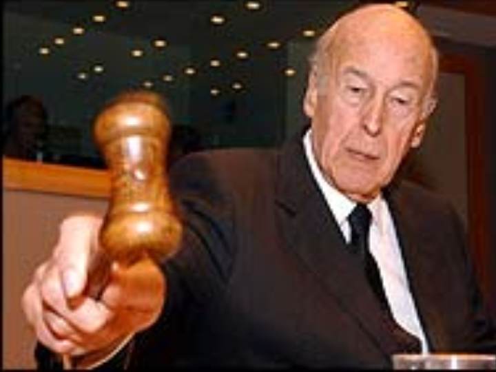 Az "alapító atyák": Robert Schuman, Alcide De Gasperi, Konrad Adenaurer és az alkotmány kovácsa: Giscard d'Estaing