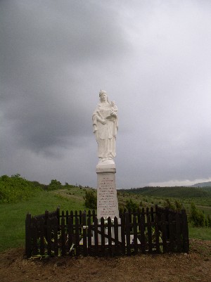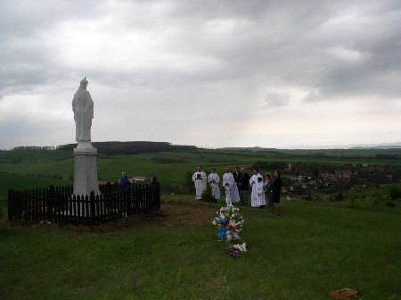 A borongós időben, a felázott, sáros úton csak egy terepjárónyian voltak fenn a szobornál, közben az ünneplő közösség a templomban imádkozta el a májusi litániát.