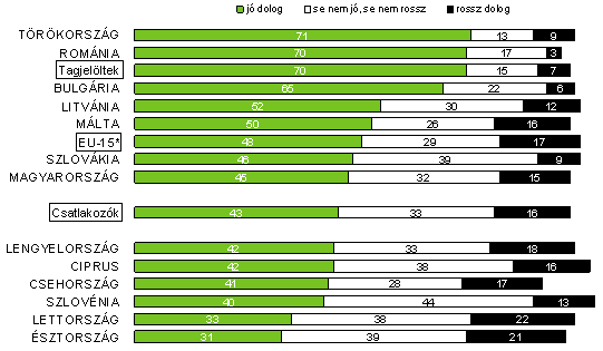 Magyarországon a megkérdezettek 45 százaléka felelte azt, hogy az ország uniós tagsága jó dolog, ennél azonban 13 százalékponttal nagyobb arányban (58%) válaszolták egy másik kérdésünkre azt, hogy Magyarország európai uniós tagsága az ország számára előnyös lesz. A csatlakozó országok átlagához képest mindkét kérdést illetően nagyobb arányt képviselnek Magyarországon a pozitív, és kisebb arányt a negatív véleményen lévők.