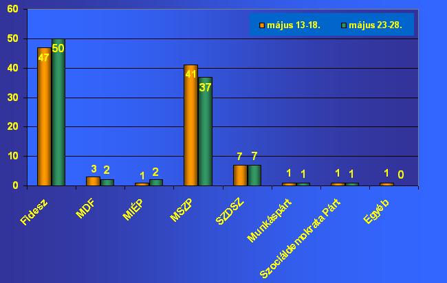 május 23-28.Fidesz 47 50 MDF 3 2 MIÉP 1 2 MSZP 41 37 SZDSZ 7 7 Munkáspárt 1 1 Szociáldemokrata Párt 1 1 Egyéb 1 0
