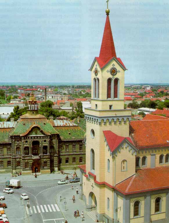 A Bega folyó kanyarulatai ölelik át Nagybecskereket, amelynek főterét uralja a képen látható templom. Nagybecskerekről még annyit, hogy két aradi vértanú neve is fűződik városunkhoz. A legfiatalabb, Lázár Vilmos a szülöttje; a másik Kiss Ernő, a bánsági nábob, akinek földi maradványai a közeli falu, Elemér katolikus templomának a szentélye alatt nyugszanak.