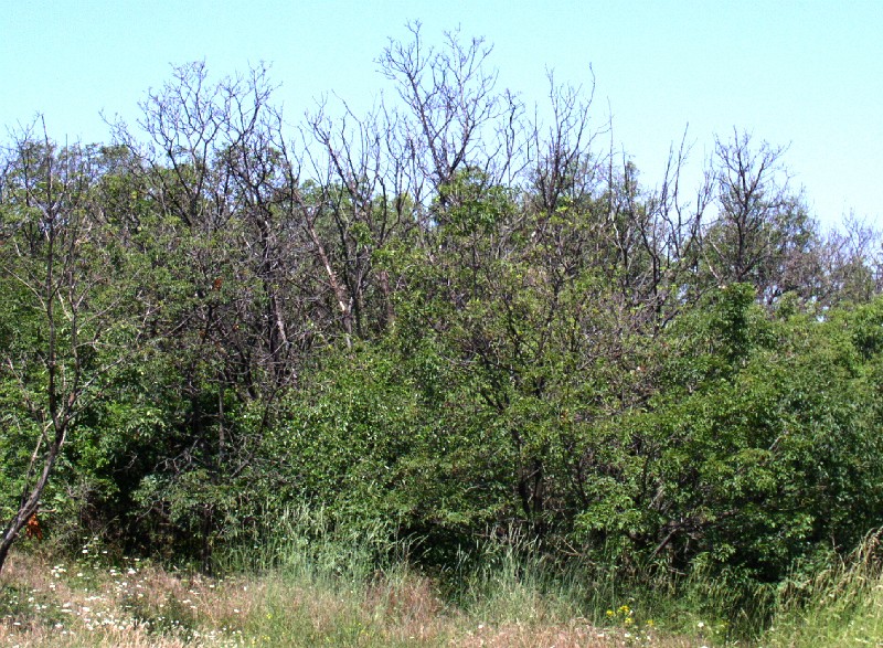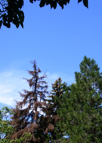 Nem bizony. Sajkod felől közelítve a helyre, már a kertekben fel-fel tűnik egy kiszáradt fa. Szomszédai még állják a sarat. A bőséges toboztermés nem utal a pusztulásra.