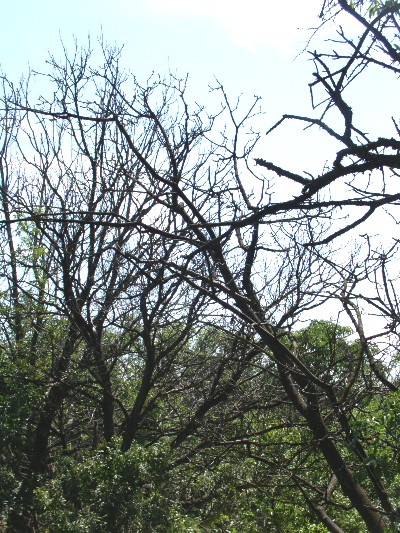 Felsétálva a hegyre kiderül, nemcsak a fenyők váratlan és indokolatlan haláláról van szó. Az erdőben egymást érik a pusztuló illetve már elpusztult fák. Szárazság? Aligha. Idén nem hiányzott a csapadék, a víz szintje is kellemesen megemelkedett a tóban. Nézzük csak, menyire elterjed a kór: