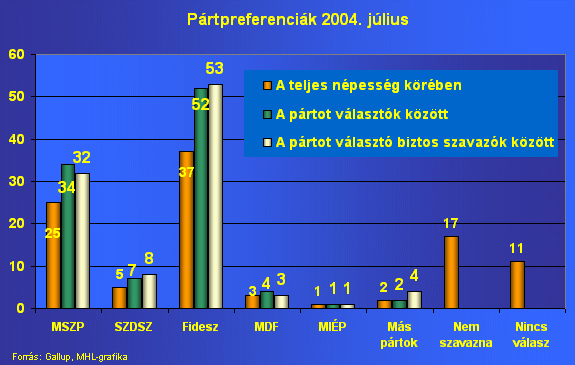 A Gallup, valószínűleg a kampány túlnyúló mobilizáló hatása miatti magas politikai aktivitás mellett, az EP-választáson született (és a Gallup által jól előrejelzett) eredményhez meglehetősen hasonlóan, az MSZP támogatóihoz képest másfélszer akkora Fideszes szavazótábort talált. Az MDF továbbra is hajszállal a bejutási küszöb alatt marad, míg az SZDSZ parlamenti kispártként látszik stabilizálódni. A pártot választó biztos szavazók körében 21 százalékpont a különbség a Fidesz javára: 53 százalék szavazna a Fideszre és 32 százalék a szocialistákra egy következő vasárnapi országgyűlési választáson.