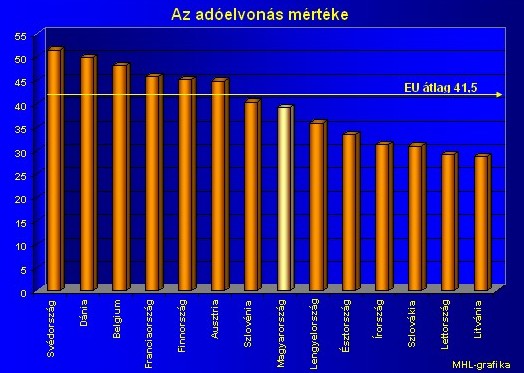 Az új tagállamokban jellemzően alacsonyabb az adóterhelés, mint a régiekben, amit elemzők az előbbiek fájdalmas gazdaságszerkezeti és jóléti átalakításaival magyaráznak. Magyarország az EU-átlagnál (41,5 %) valamivel csekélyebb, 39,2 százalékos adóelvonási szinttel "büszkélkedhet", hiszen az új tagok között ez a második legmagasabb szint, csupán Szlovénia sarcolja meg ennél is jobban polgárait (40,3 %). A magyar adat magasabb adóterhet jelent a görög és a portugál rátánál is.