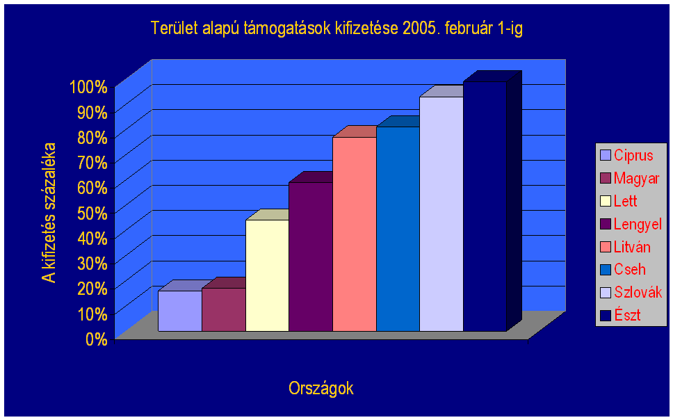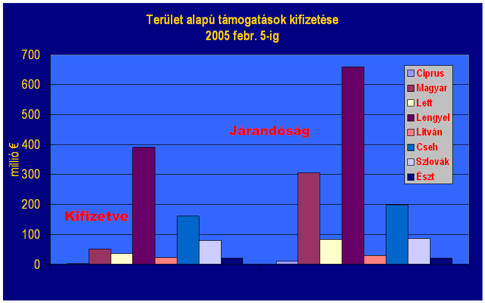 Az Európai Bizottság legutóbbi jelentése (2005. március 10.) szerint Magyarországnak nem sikerült kihasználnia a tavalyi uniós területalapú támogatásokat. Hazánknak csupán a területalapú támogatás 17 százalékát sikerült lehívnia. Magyarországnál csak Ciprus teljesített gyengébben.