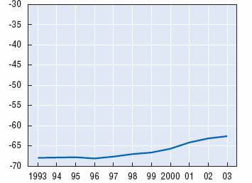 Az ábra vízszintes tengelyén 1993-tól 2003-ig terjedően látjuk az adatokat, a függőleges tengely pedig azt fejezi ki, hogy a magyar GDP hány százalékkal van elmaradva az Egyesült Államokétól.