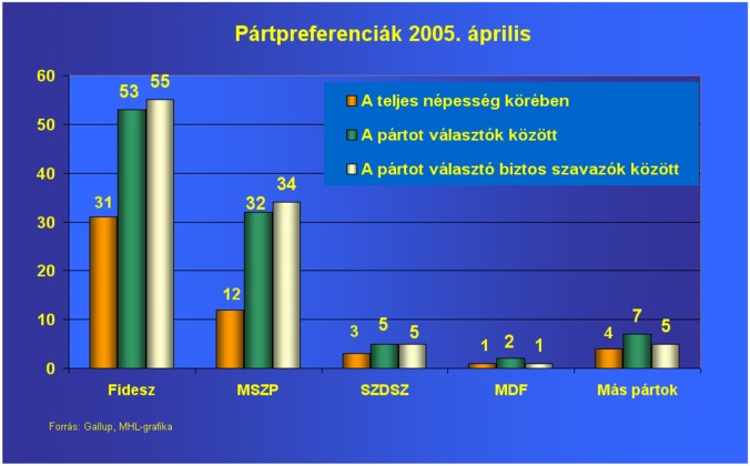 Ezzel szemben, azok aránya, akik elégtelennek tartják miniszterelnöki tevékenységét, ugyancsak november óta minden hónapban szignifikánsan növekszik. A novemberi 23 százalékkal szemben az elmúlt hónapban 47% volt az elégedetlenek aránya. Április végére ez az arány tovább növekedett és mostanra már a megkérdezettek 51 százalékát teszi ki ez a tábor.Bővebben: http://www.gallup.hu/Gallup/release/ppref050422.htm melyből különösen az iskolai végzettség, és a lakhely szerinti pártpreferenciákat érdemes elemezni.