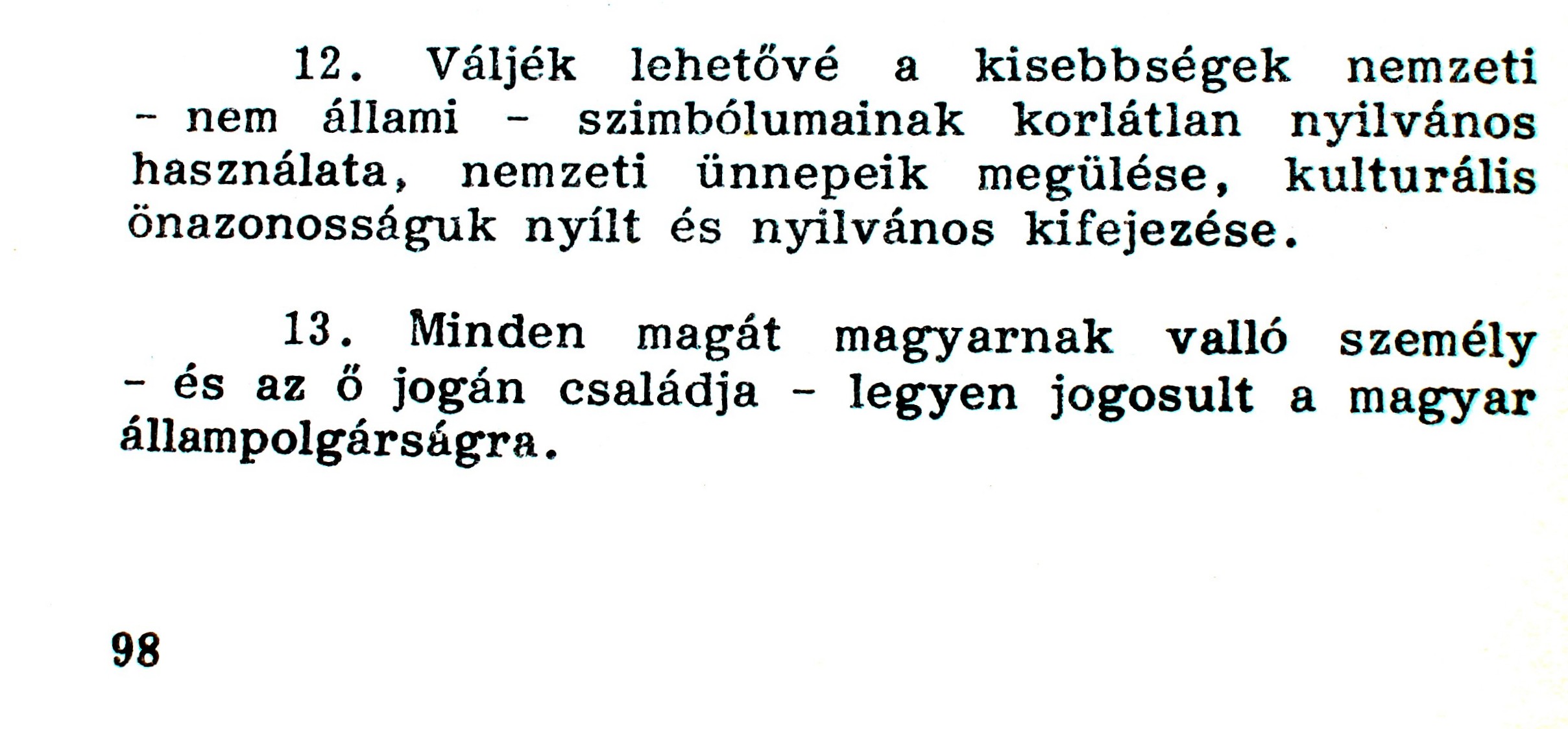 Ez a 13. pont 16 évvel később végzetesnek bizonyult. 2004. december 5-én főleg a határontúliaknak volt végzetes, de a soproni előjelek alapján könnyen lehet, hogy az SZDSZ-nek is az lesz. Mert a fenti kijelentés: "Minden magát magyarnak valló személy - és az ő jogán családja - legyen jogosult a magyar állampolgárságra" - rútul megcsalatott.
