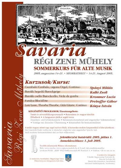 Savaria Régi Zene Műhely - augusztus 14-től 21-ig – Szombathelyen. Örvendetes az egyre növekvő igény a fiatal muzsikusok között éppúgy, mint a tanárokban, a régi korok muzsikájának stílusos, korhű megszólaltatására. Erre teremt alkalmat ismét Szombathely: a város központjában – Európa egyik legszebb copf stílusú terén – az Egyházmegyei Kollégium ad otthont a Régi Zene Műhelynek. Szombathely városában mintegy negyedszázada ébredt fel az érdeklődés a régi korok zenéjének korhű megszólaltatása iránt. A Capella Savaria, a Szombathelyi Régizene Együttes, a Capella Cantorum számtalan nagysikerű koncerten hozta el közönségének a reneszánsz, a barokk majd a klasszikus kor muzsikáját. Emellett folyamatosan szerveződtek a város által mindig is támogatott régi zenei kurzusok. Az elmúlt évtizedben a Szombathely Régi Zene Hét (1993) és Szombathelyi Régi Zene Nyári Akadémia (1996-98) örvendett nagy látogatottságnak.