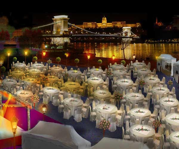 A pultok még akár rendben is voltak, de a föléjük boruló fehérponyvás sátortetők rendje, bizony, a ligeti majálisok vurstli-déja vu-jét erősítette; amely sátortetők, erről se feledkezzünk meg, épp azt fedték el, ami a korábbi látványtervek szerint (lásd képünket) az elgondolás erejét hordozta volna. Budapest látványosan kivilágított panorámájának „báli díszletét”… Összességében tehát, az arra sétáló azt láthatta: elegánsan öltözött hölgyek és urak ballagnak a lacikonyha felé, a harmincfokos hőségben, hogy onnan magukhoz vegyenek némi alacsony tápértékű, kalóriaszegény grillezett étket, miközben egy hatalmas megasztár-színpadon Gyarmati István bárzongorázik. Elveszvén a tér és idő távlataiban… A színpad, amúgy, a későbbiekben betöltötte hivatását: előbb és utóbb a Hollander zenekar játszta rajta a tánczenét; nem mindig találván el az úri közönség óhaját; közben pedig hallhattuk a Rómeó és Júlia keresztmetszeteként felkonferált négy dalt, az Operettszínház néhány – név szerint be nem mutatott – művészétől. Jók voltak, de a musicalt vélhetően nem ők tették az évad egyik sikerdarabjává a pesti Brodway-n… Volt, persze, koktélbár és tombola; és volt szépek szépe választás. A zsűri tagjait nem ismertetném, inkább arról szólnék, aki biztosan nem vett részt munkájukban: a közismerten elfogulatlan Varázstükör, aki például Hófehérkéről elég konzekvensen bírt véleményt alkotni…