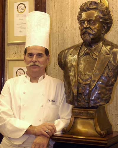 Az asztalokhoz felszolgált vacsora íze és mennyisége ismét a séf (képünkön Kalla Kálmán, a Gundel „védjegye”) rutinját igazolta. Az előbbi kétséget sem hagyott afelől, hogy az utolsó falatot se hagyjuk a tányéron; az utóbbi pedig lehetővé tette azt, hogy a bőséges édesség-kínálatból akár hajnalig csipegethessünk. Már aki megreszkírozta; én, sajnos, csak módjával. Hiába: őriznem kell keservesen megszerzett mínusz harminc kilóm örömét; de azért, ha már erről kérdeznek (vagy nem kérdezték? Hogy lehet ez?); nos, ha már valahogy – ügyesen – szóba hoztam, hát hadd mondjam el: nagyon ügyetlenek a „fogyjanak le” propagátorai. Mert, igazából, csak egyet kellene kérdezniük: kedves uram. Keringőzött már Ön ólommellényben? És anélkül…?