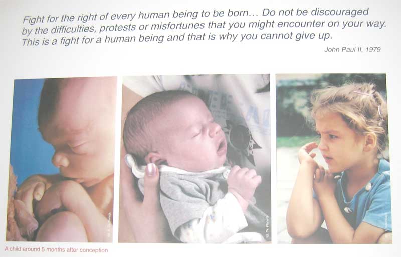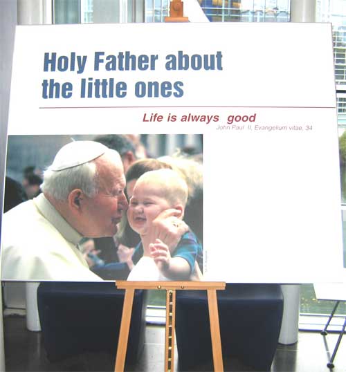 Világosan fogalmazó magzatvédelmi kiállítás nyílt november 15-én az Európai Parlament épületében. A mindössze néhány poszterből álló kiállítás részben II. János Pál idézetekkel mutatott rá, mennyire védendő az élet minden formája, különösen a meg nem született élet. Részben a modern kor adta képalkotó eljárások felhasználásával mutatta meg a kiállítás, mennyire emberi alakja van már a csak néhány hónapos magzatnak is.