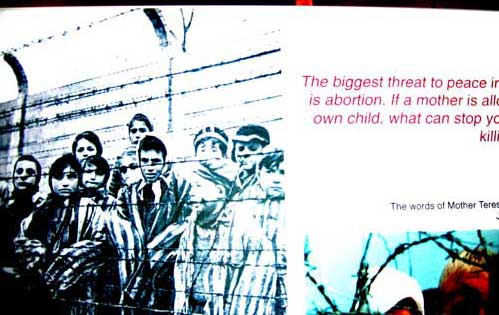 A képek egyike Teréz anyát idézte: A mai világban a béke elleni legnagyobb kihívás az abortusz. Ha az anyának megengedik, hogy megölje gyermekét, mi akadályozhat meg téged és engem, hogy megöljük egymást?