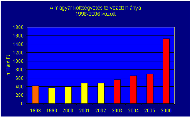 Az ábra azt mutatja meg, hogy az adott évben hány milliárd forinttal tervezett többet kiadni a költségvetés, mint amennyi az adott évre várt bevétel. Az 1998-as értéket még a Horn kormány tervezte, ezt jelzi a színeltérés, majd az Orbán kormány által tervezett négy év következik. Vörös szín jelzi a most kormányzó szocialista-liberális koalíció egyre emelkedő kiadásait.