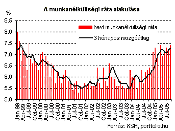 Az ábra a KSH adataira épül, s magyarázó cikkel együtt olvasható a portfolio.hu oldalán. Az 1999 óta megindult csökkenés 2002 nyarán megállt, s 2003 őszétől ismét jelentősen növekvő munkanélküliséggel találkozunk.