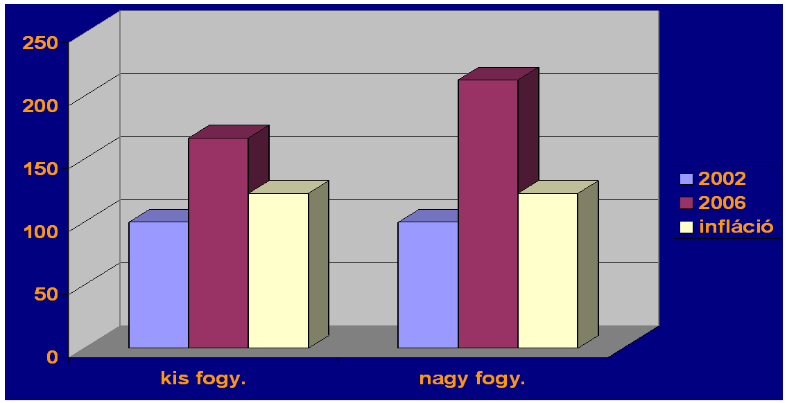Az ábrán a 2002. évi gáz ár százalékában fejeztük ki a mai értékeket. A kormányzás átvételekor érvényes referencia szint adja az ábrán a 100 százalékot, s ehhez képest a bordó oszlop jelzi a szocialista kormány teljesítményét. A harmadik oszlop azt az értéket jelzi, ahol ma tartana a gáz ára, ha csak az inflációval növekedhetett volna.